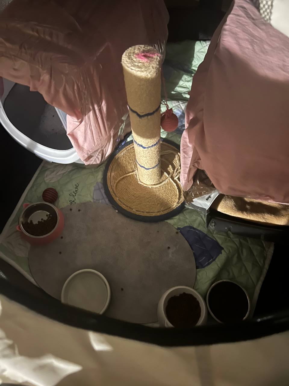 Вот что у меня получилось сделать им сегодня: переноску и лоток обернула мусорными пакетами, сверху простыней в несколько слоев, тк залезают наверх и рвут когтями полиэтилен. Колхоз, но делаю, что могу 🤷♀️😢 если есть советы как лучше их защитить от дождя, буду признательна ❤️🙏