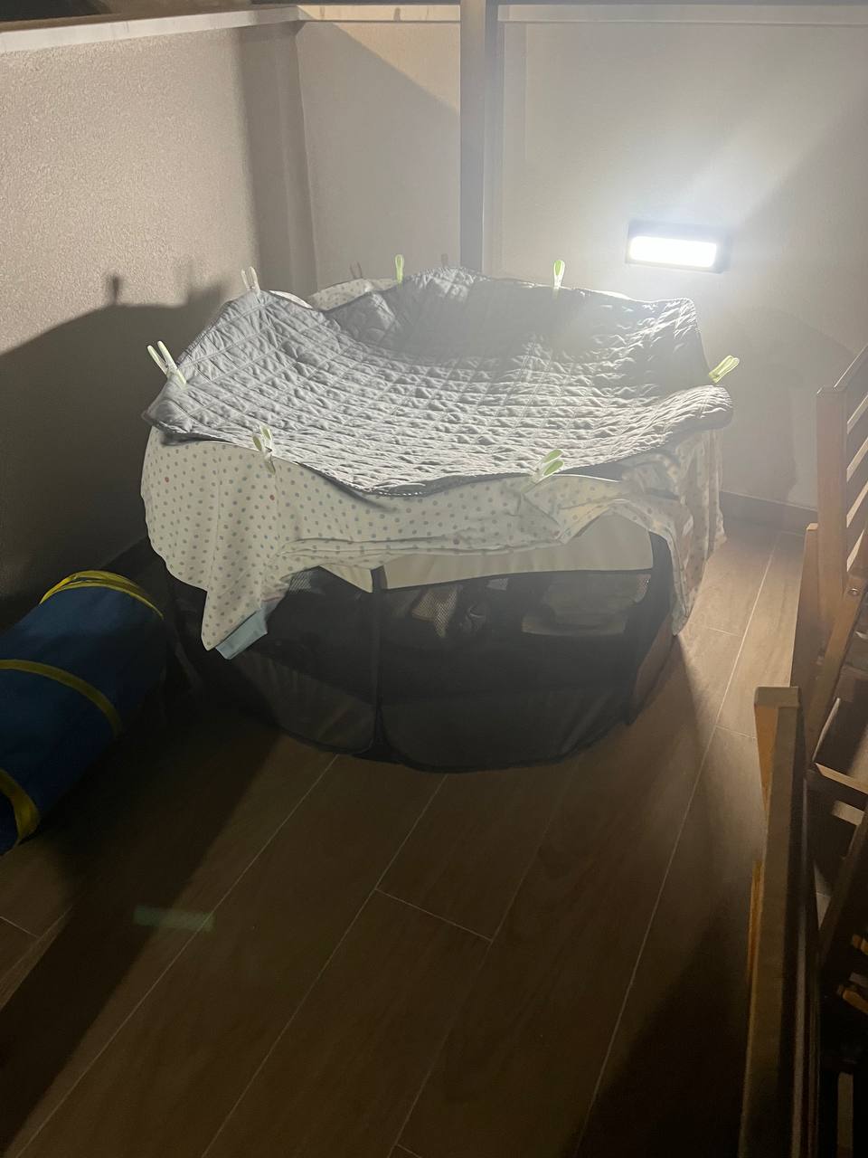 - укрытие от дождя на крыше. Кстати, вот эти коврики с тему рекомендую очень, у меня есть один такой, он впитывает влагу, но вообще не пропускает ее, выручает сейчас невероятно, использую его в качестве крыши на манеж, но проблема что он только один(( и просушивать его нет времени(( и на пол бы такой им постелить. Второй манеж нашелся, завтра буду думать чем их скрепить)