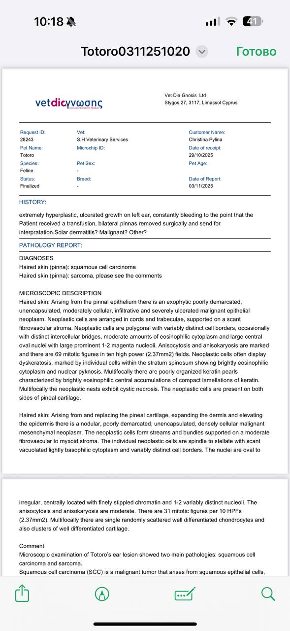 На приеме был доктор Мариос, сказал: «сейчас кошка(кот?) в стрессе, операционная занята, поэтому в данный момент мы не можем осмотреть подробно - пол, возраст.. что точно происходит. Скорее всего - это solar dermitits - солнечный дерматит, потому что рана на выглядит свежей. 90% ушко нужно ампутировать.. 💔😭😭😭