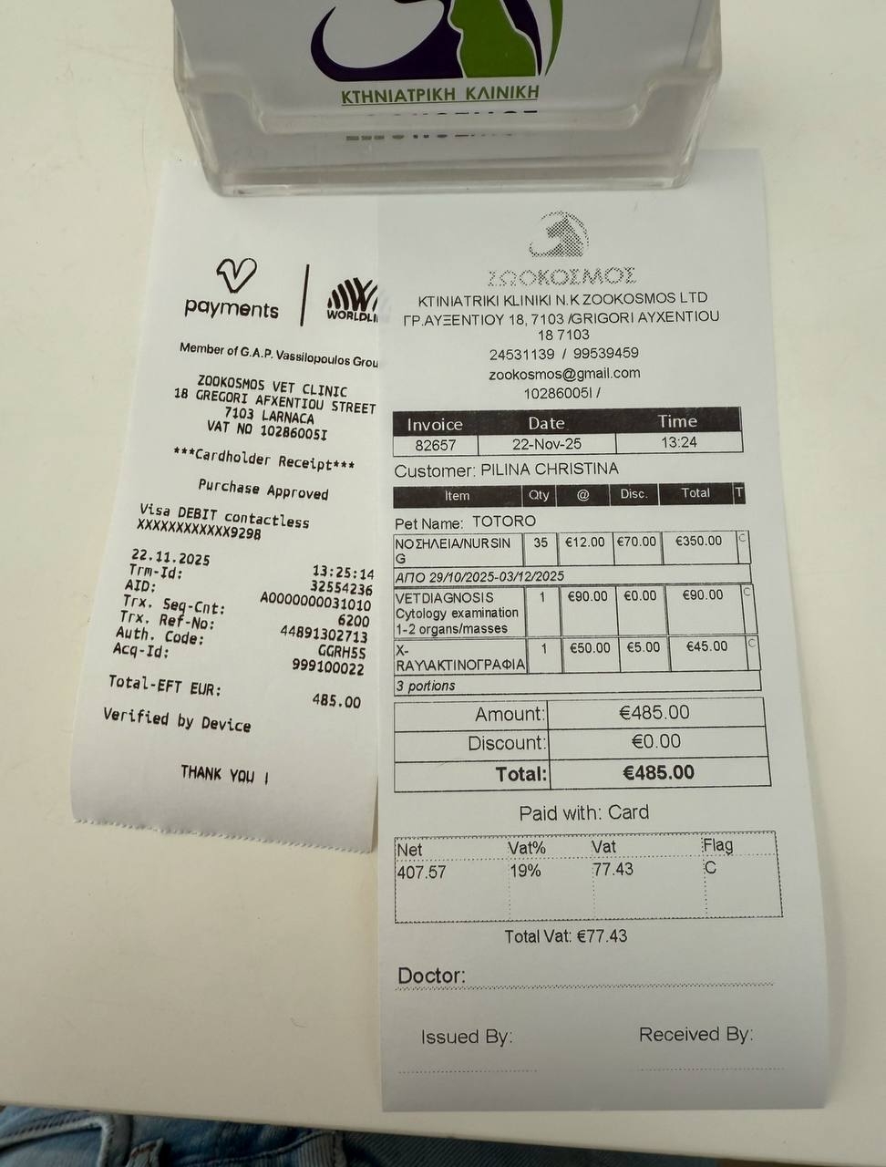 Завтра, надеюсь, буду понимать сумму лучше. Точно до вторника - Тоторо остается в клинике.. я оплатила 40 евро за первый день стационара.