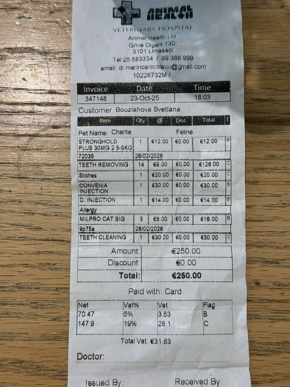 Хочу поделиться историей про Animal Health доктор Кристина. Моя соседка отвезла к ним больше месяца назад нашего дворового кота, он перестал есть, оказалось, что у него проблема с зубами. Сделали уколы и сказали потом привезти на проверку и возможное удаление зубов. После уколов он начал есть, но моя соседка записала его и вчера утром отвезла в клинику, а сама уехала на работу, ей сказали, что вроде не всё так страшно. Днём ей позвонила доктор Кристина и сказала, что удалили несколько зубиков и вколят укол. Так как она не могла забрать до 7 вечера, за ним поехала я. Как оказалось, ему вырвали 14 зубов, почистили зубы, сделали несколько уколов, в том числе от блох и всунули таблетки от глистов. Счёт вышел на 250 евро. Сегодня моя соседка созвонилась с доктором и спросила, зачем ему вырвали 14 зубов, она же говорила, что там всё не страшно, та начала оправдываться, что она такого не говорила, а говорила обратное (не могу не верить соседке, она переживает за этого кота больше меня). Мы в шоке. Коту меньше года и уже без 14 зубов и мы даже не уверены, что всё их удаление было нужно, потому что кот ел и если и были больные зубы, то явно не так много. Ощущение, что они это сделали ради денег и потому что это всё равно уличный кот. Нам его очень жалко, весь рот опухший, но благо ластится и чувсвтует себя не так плохо.