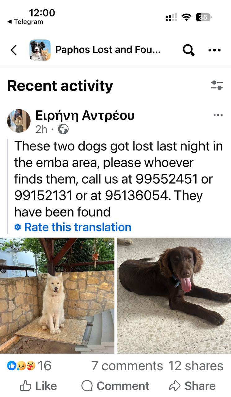 в пафосе в районе эмбы заметили двух собак, никто не потерял? коричневый лабрадор и овчарка белая с ошейником