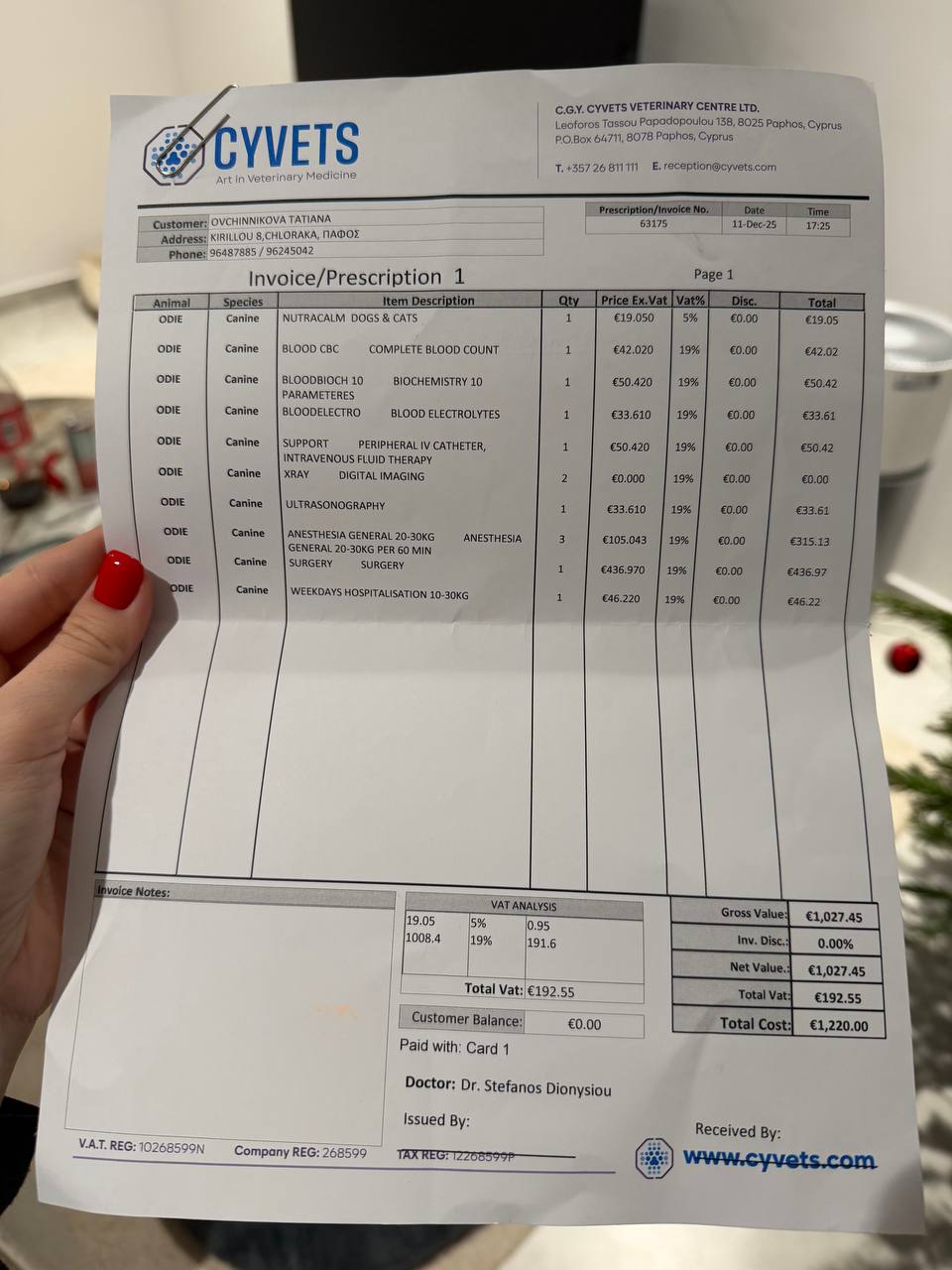 Еще через 5 дней у собаки начались гнойные выделения. Мы опять поехали в D&N и нам выписали антибиотики. Мы попили антибиотики и еще через пару дней собака перестала писать.... это был воскресенье. Спасибо глав.врачу Dr. Dimitris Dimitriou. Он нас осмотрел и сказал, что понадобится операция. Позвонил в CyVet доктору Япанису и нас записали на следующий день на операцию и обследования.