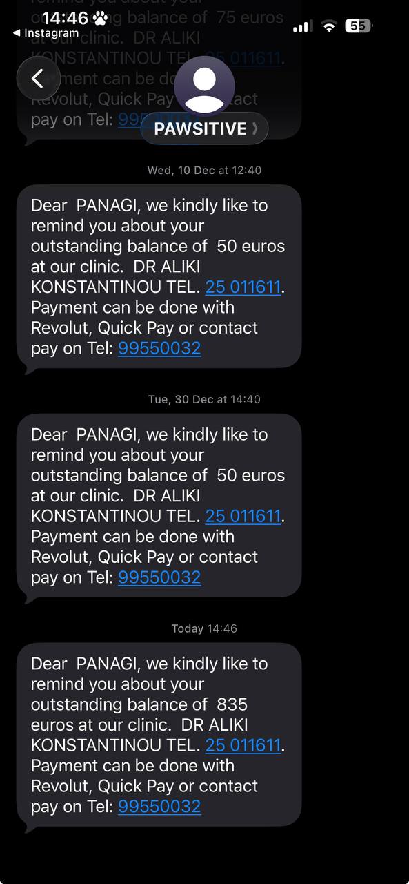 К сожалению, сейчас я переживаю очень трудный финансовый период, и впервые я не могу справиться одна. На сегодняшний день общая сумма задолженности перед Dr. Aliki составляет 835€.
