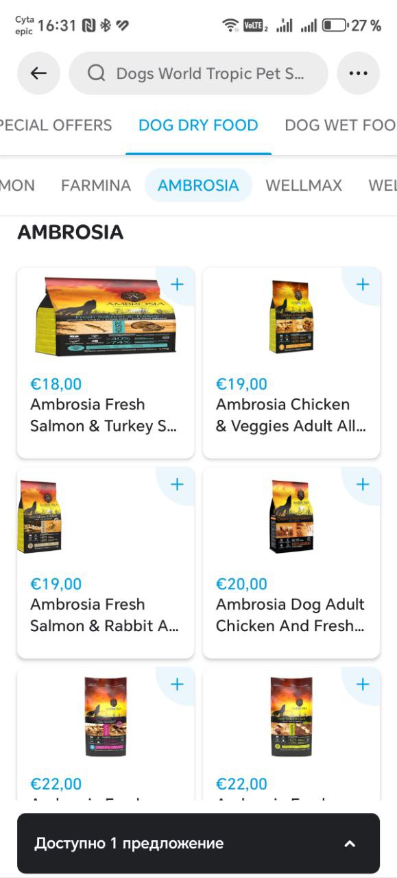 @NanaIronВообще чат гпт хорошо ищет, если есть время подождать доставку, то вот вариант. https://petsforall.com.cy/en/product/1596-ambrosia-dog-growth-chicken-and-fresh-fish/