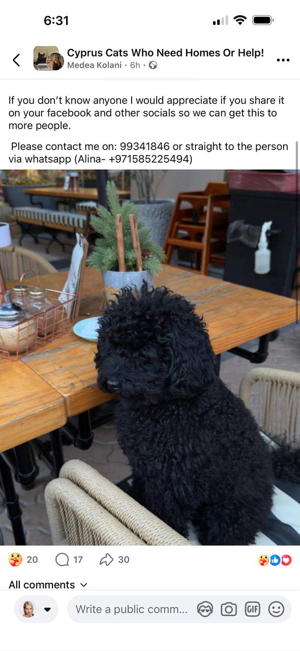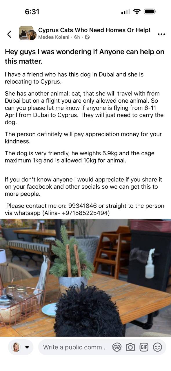 Сегодня в FB девушка из Дубаи как раз ищет способ вывезти собачку (пудель) на Кипр. Она летит с котиком, но по правилам авиакомпании может взять в кабину только одно животное. Поэтому миниатюрному пуделю (5.9 кг) ищет flight buddy в период с 6 по 11 апреля.