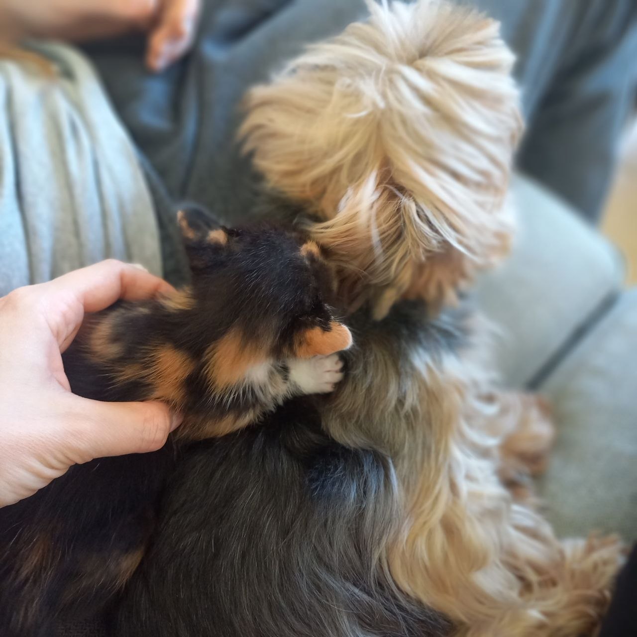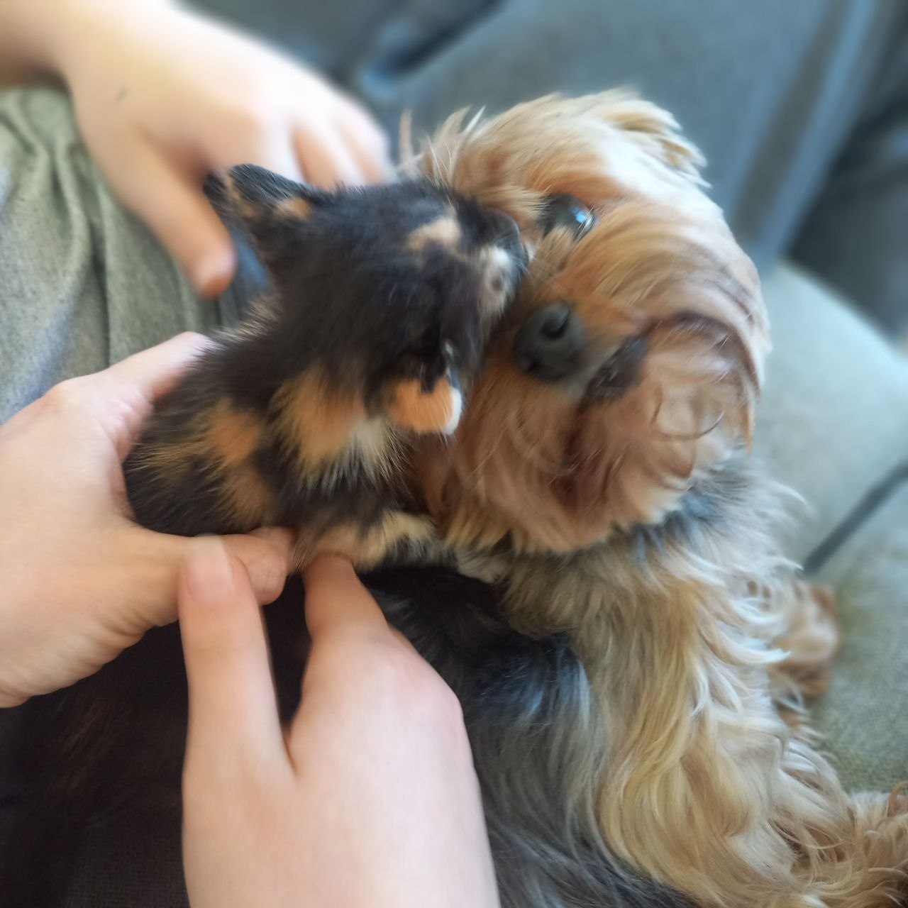 Малышка с каждым днём становится всё активнее! Продолжает осваивать территорию; помимо взрослых котов, познакомилась с нашей собакой 😁