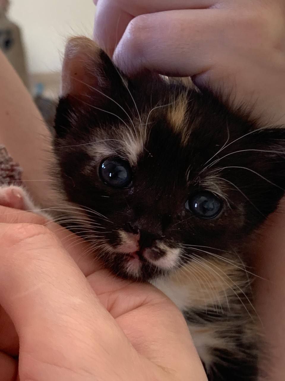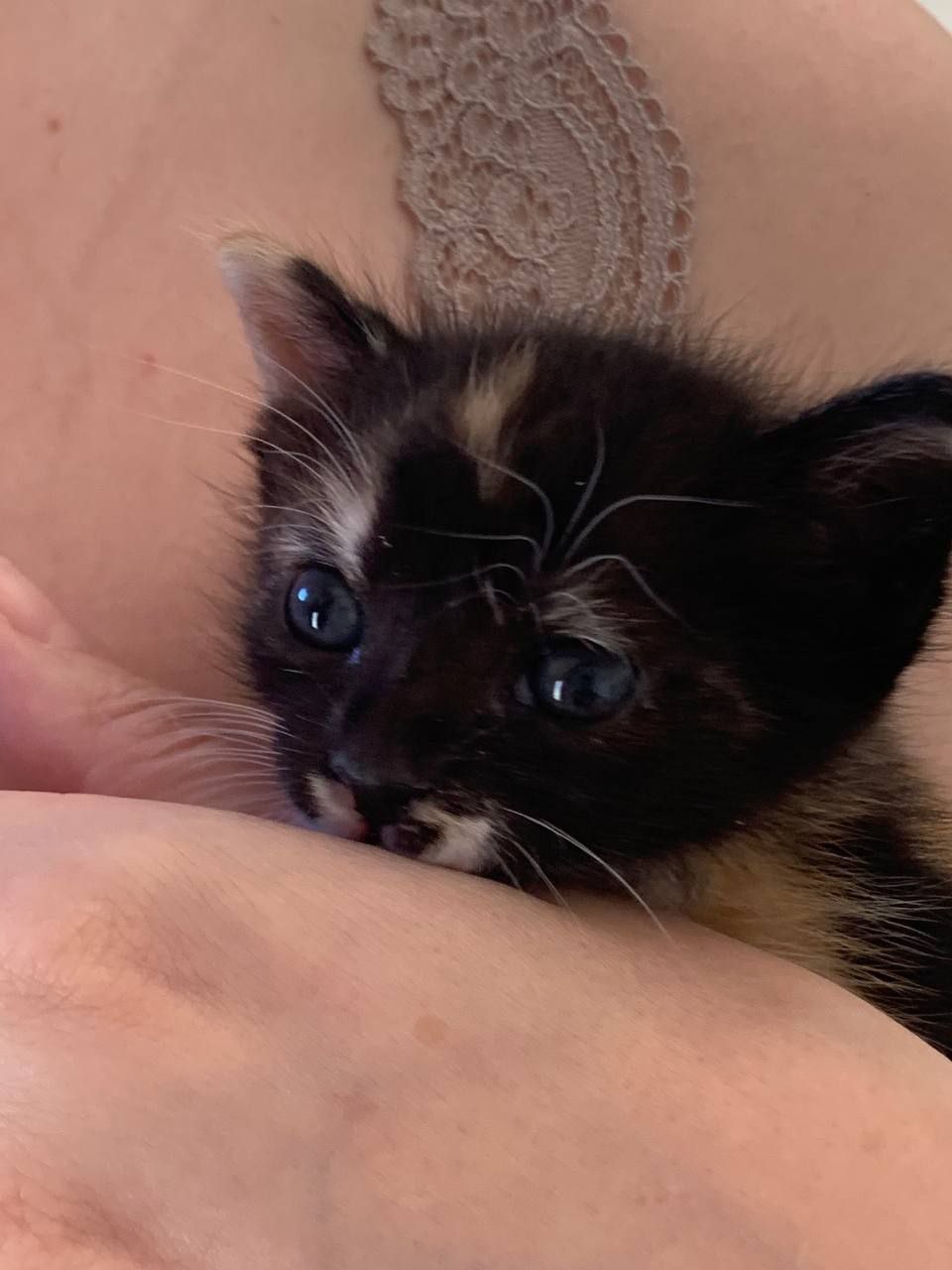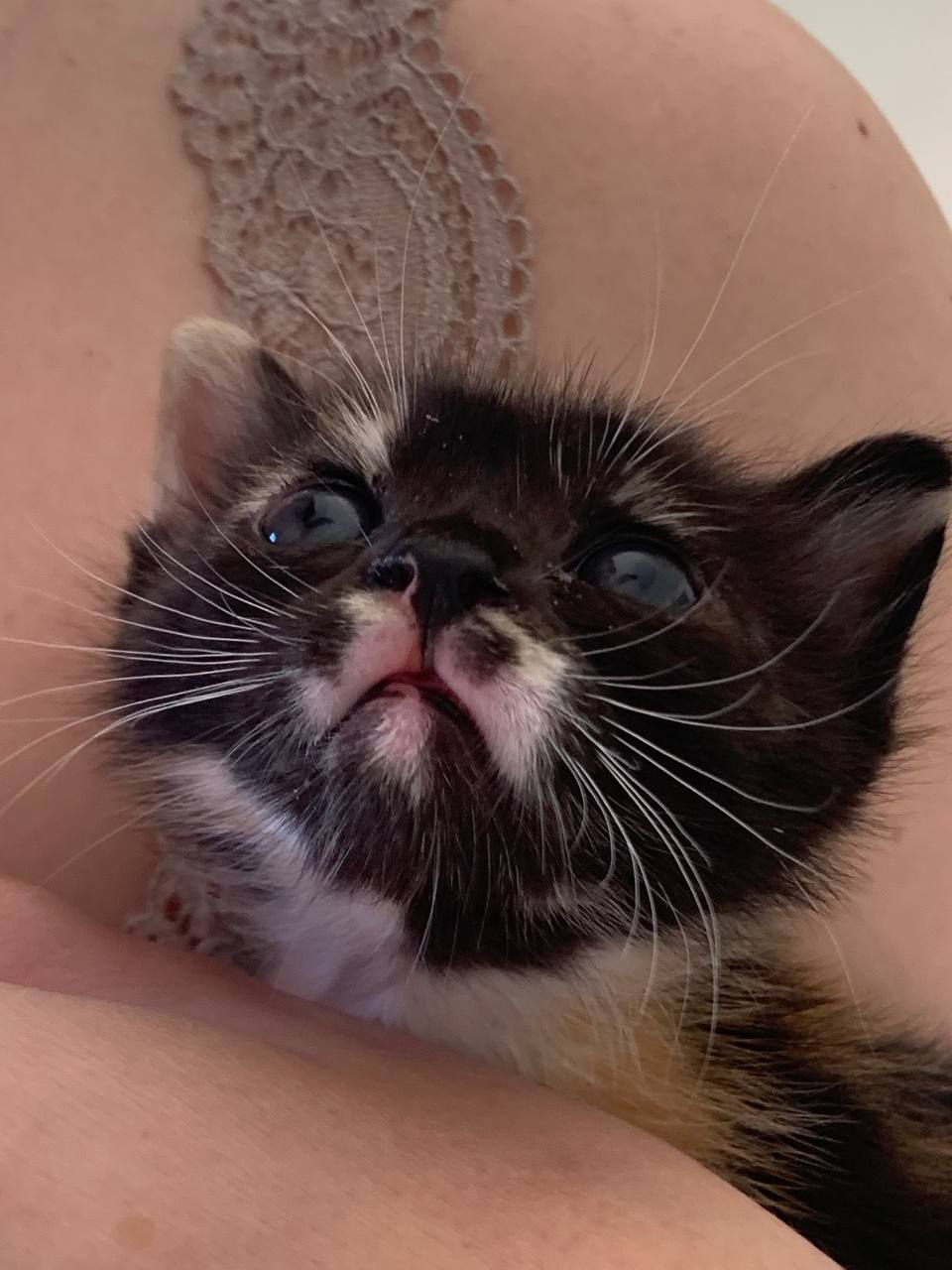 Этой крохе всего 3 недели, но за это время она пережила настоящее испытание. Мы обнаружили её в капоте нашей машины, после того, как съездили с ней до школы и обратно 😲🫣 Похоже, что она оказалась там ночью, мы услышали её писк утром и смогли достать только к 2 часам дня. Глазки были ещё закрыты и залеплены, ушки прижаты, на вид ей было не больше недели. Она была мягонькая, как тряпочка... Но продолжала цепляться за жизнь!! Мы сразу же купили смесь для котят, и она смогла съесть несколько спасительных капель. После чего мы отвезли её к ветеринару. Он выписал антибиотик для глаз и тепло. Визуально она была чистенькая и здоровая. Мы привезли её домой, согрели, сделали ей тёплое гнёздышко и начали выкармливать из бутылочки каждые два-три часа и капать в едва открывшиеся глазки.
