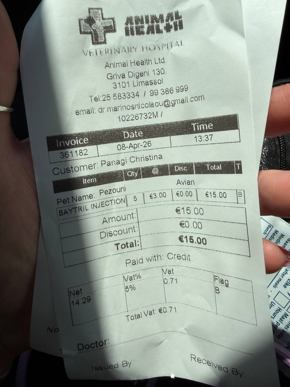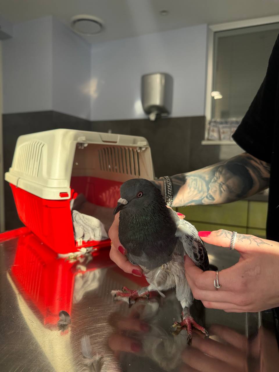 @kristinktattooВсем привет, вчера утром у меня на работе машину наехала на голубя. Он всё ещё жив и, кажется, у него нет видимых травм, но я переживаю, что может быть внутреннее кровотечение. Его глаза немного красные, но не сильно, поэтому я не уверена. Я написала Кристине из клиники Marinos, и она сказала, что может дать только обезболивающие и антибиотики. Я думала, что у меня дома есть Meloxidyl для кошек, но его не оказалось. Я поехала в клинику доктора Стелиоса поздно вечером после работы, но мне не смогли ничего дать без рецепта. Сейчас я везу голубя к своему ветеринару, чтобы она его осмотрела. Я очень рада, что он всё ещё жив 🙏🏻