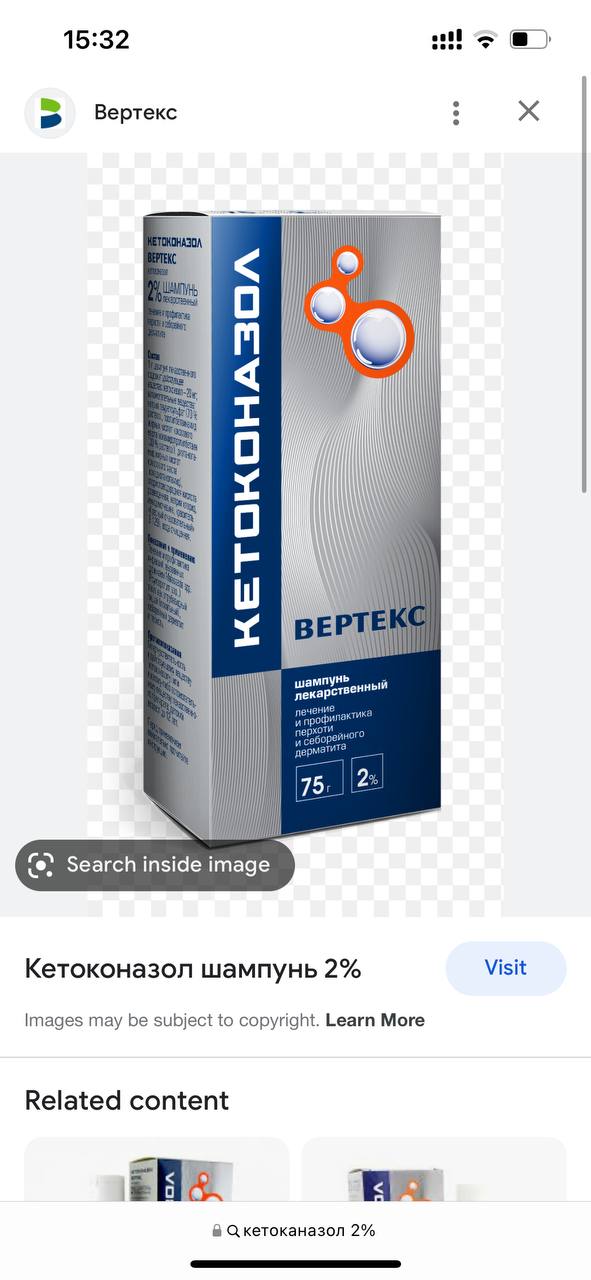 Нашла на Кипре вот такой шампунь с кетоконазолом. У самоеда на острове сильно покраснели лапки, решили попробовать мыть лапы и оставлять минут на 5.