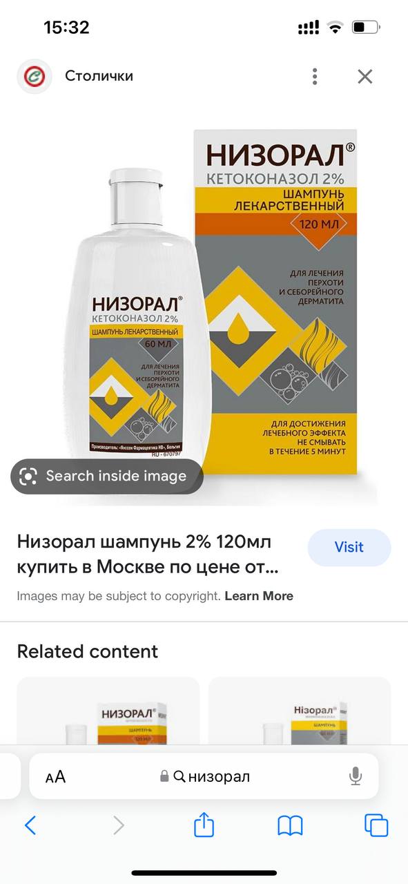 Можно купить в человеческой аптеке любой шампунь с кетоканазолом 2%, главное чтоб в составе был этот компонент.