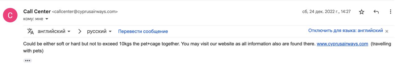 Добрый вечер! Прошу прощения, наверняка вопрос избитый… Полистала поиском чат - не нашла точного ответа. Если лететь Cyprus airways с котом в салоне, то им не принципиально - мягкая или твёрдая переноска? На сайте нашла только допустимые размеры…