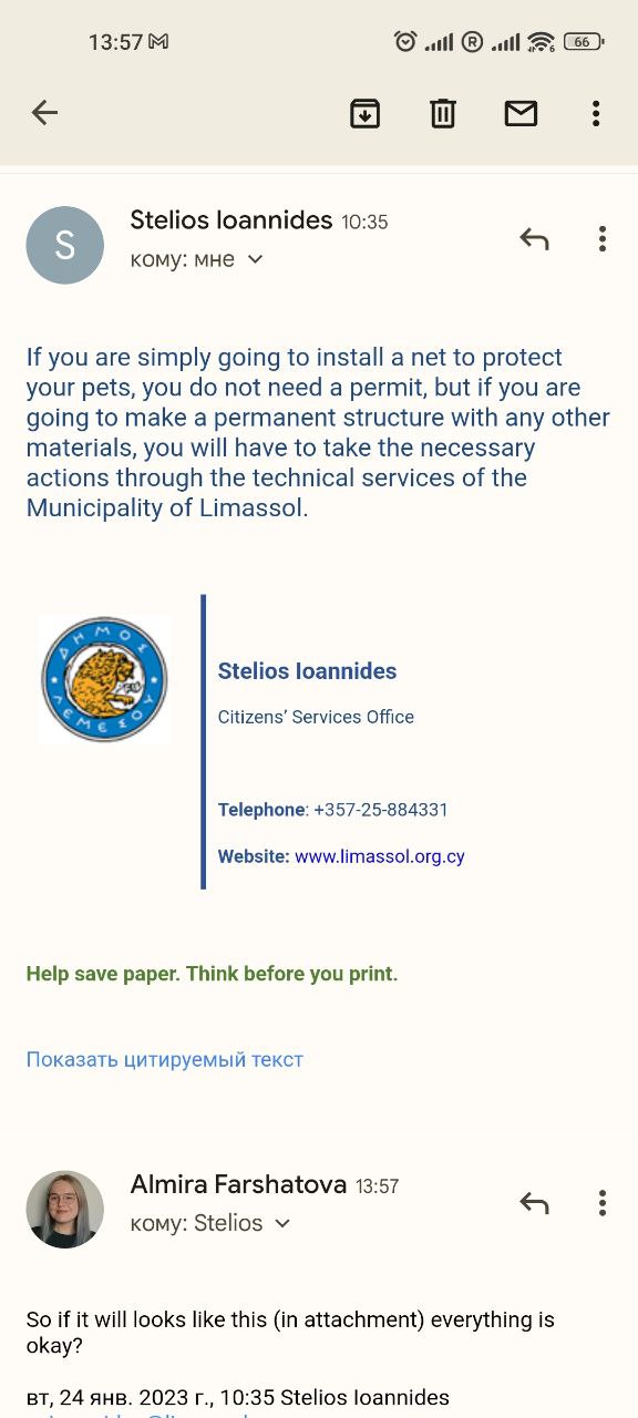 Я просто нагуглила муниципалитет нашего района и написала на основную почту (General department) и в технический департамент. Написала, что сетка для защиты наших питомцев от травм и побегов, они в ответных письмах написали, что от них пермитов не требуется
