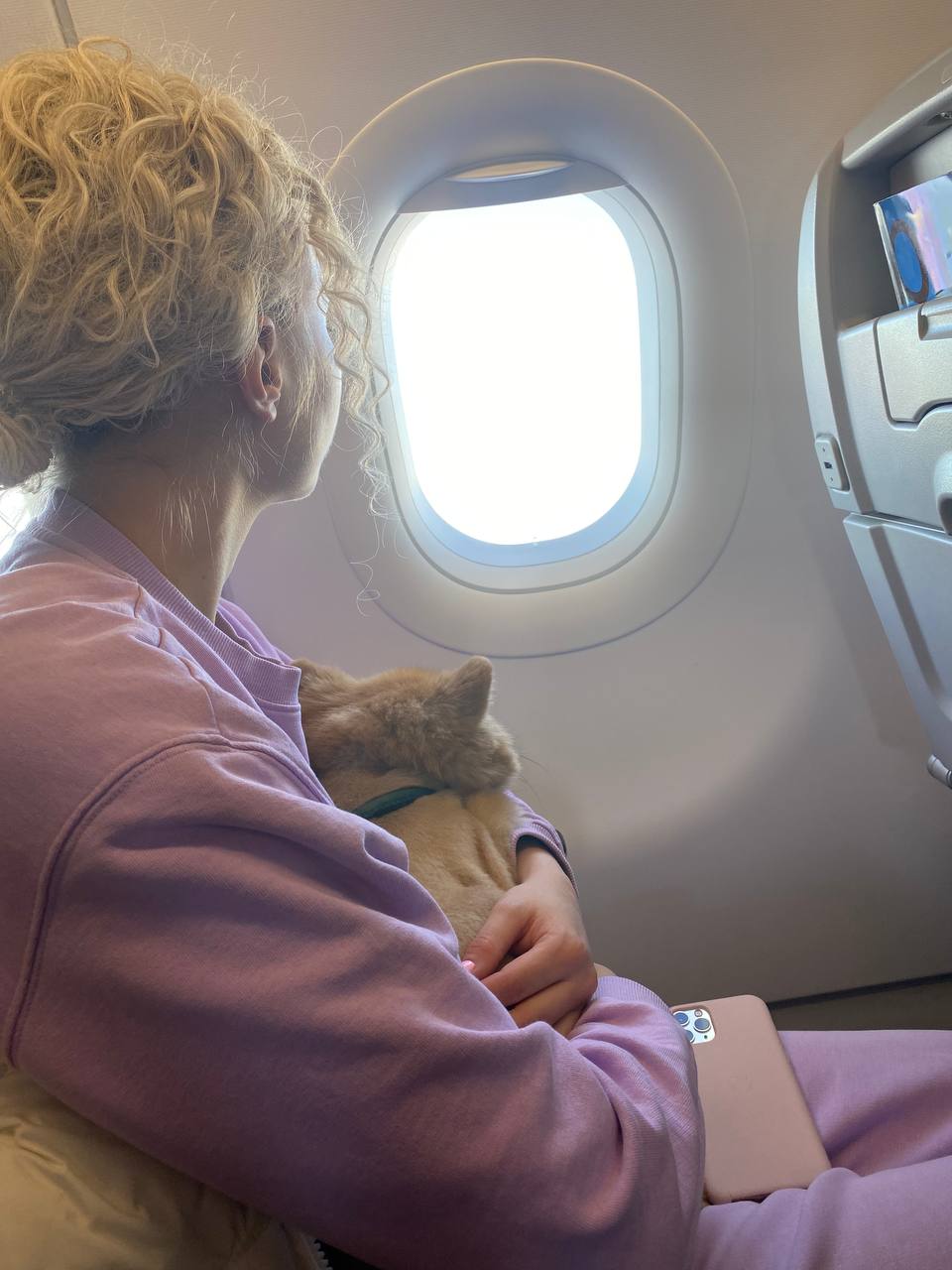 Только на вход проносили в переноске, дальше на руках, но это именно от стюардесс зависит. До Еревана летели wizz air, ночевали в Ереване, оттуда аеганами через Афины. Во всех аэропортах просто на поводке (и даже без) ходил, в самолете на ручках сидел и всё просто умилялись