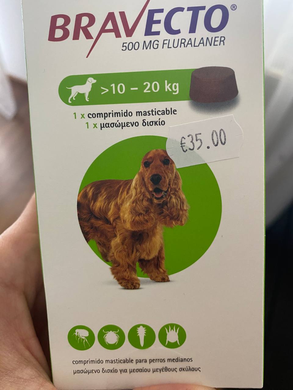 В Пафосе Бравекто есть в любой клинике. Вместе с глистогонным на собаку 27 кг - 42 евро.