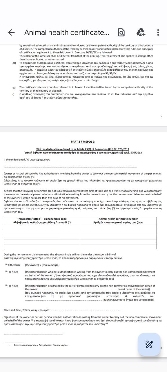 - письменная декларация, подписанная владельцем и подтверждающая, что перемещение является некоммерческим - это последняя страничка из ветсертификата, который вы будете получать для въезда в ЕС, см. скрин. Целиком этот файл есть на странице ветслужбы Кипра (но вообще это стандартный сертификат для всех стран ЕС), раздел Entry from third countries, гиперссылка health certificate и отдельно декларация written declaration): http://www.moa.gov.cy/moa/vs/vs.nsf/vs07_en/F7E307422C0B1B99C22575350040DAE2?OpenDocument