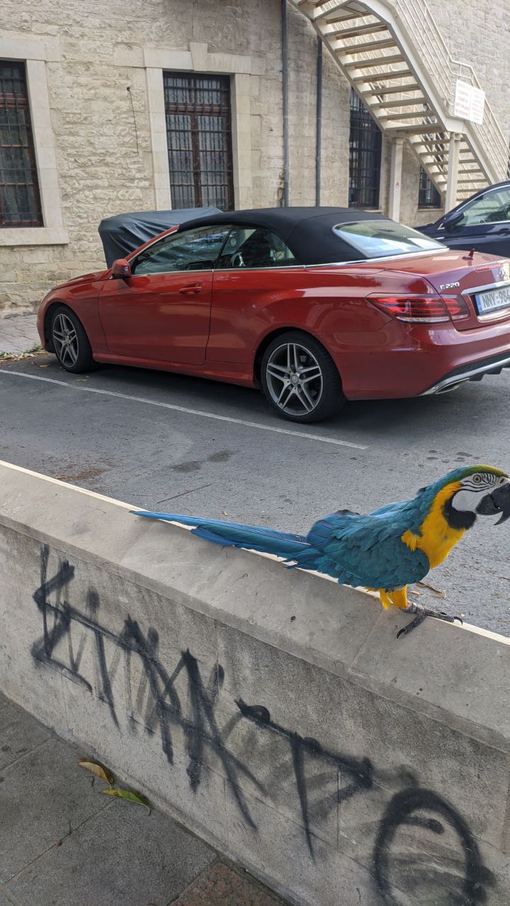 Привет. В центре Лимассола встретил дружелюбного попугая ару, на лапах кольца. Просто сидел на заборе. Видимо потерялся.