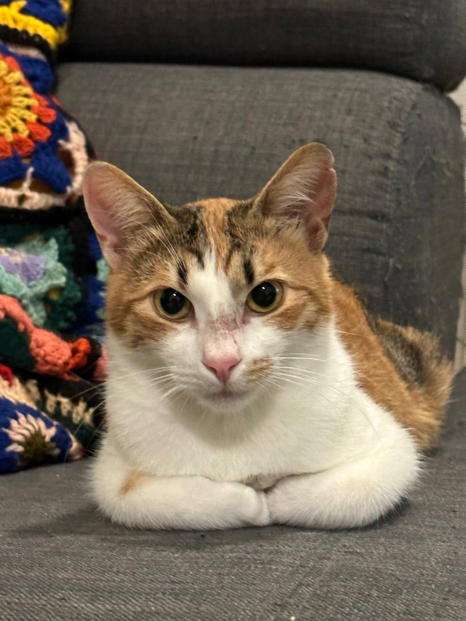 Трехцветная, надрезано левое ухо, отзывается на кличку Гречка / Греча. Очень ласковая, идет на руки.