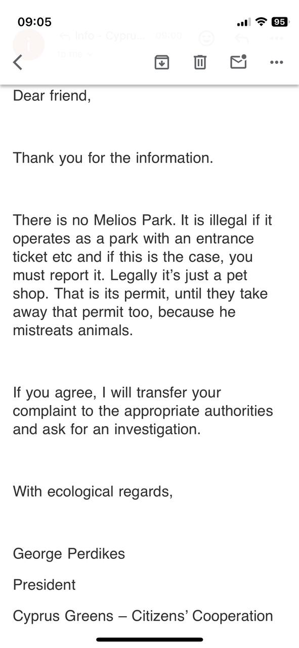 Я писала в несколько инстанций, и сейчас мне ответили из Кипрской партии зеленых. Пишут что у этого места нет лицензии даже не зоопарка, а просто обычного парка, и они не имеют права продавать билеты. Сейчас у них лицензия петшопа (что вообще то странно) и в такой ситуации ее тоже скорее всего отберут