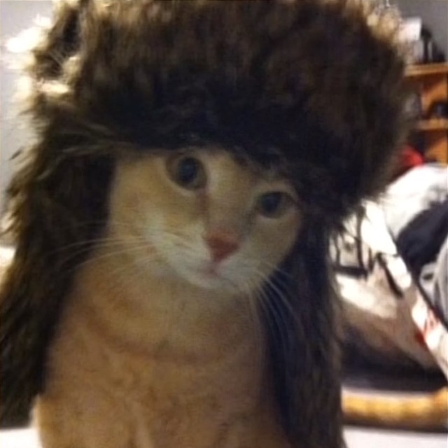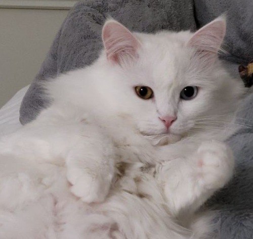 Белого цвета. Из отличительных особенностей - разного цвета глаза (гетерохромия). Боится всего, на улицу никогда не выходил