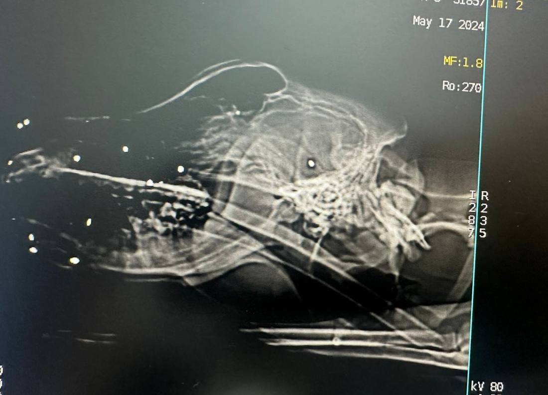 А вообще КТ классная штуковина, конечно. Мало того, что расставила точки на i, выявив инородное тело и закончив бесполезный курс антибиотиков, так и нашла иные интересности из доприютской жизни пса. Точки на снимке-дробь, на нижней челюсти- место входа дроби, скорее всего.
