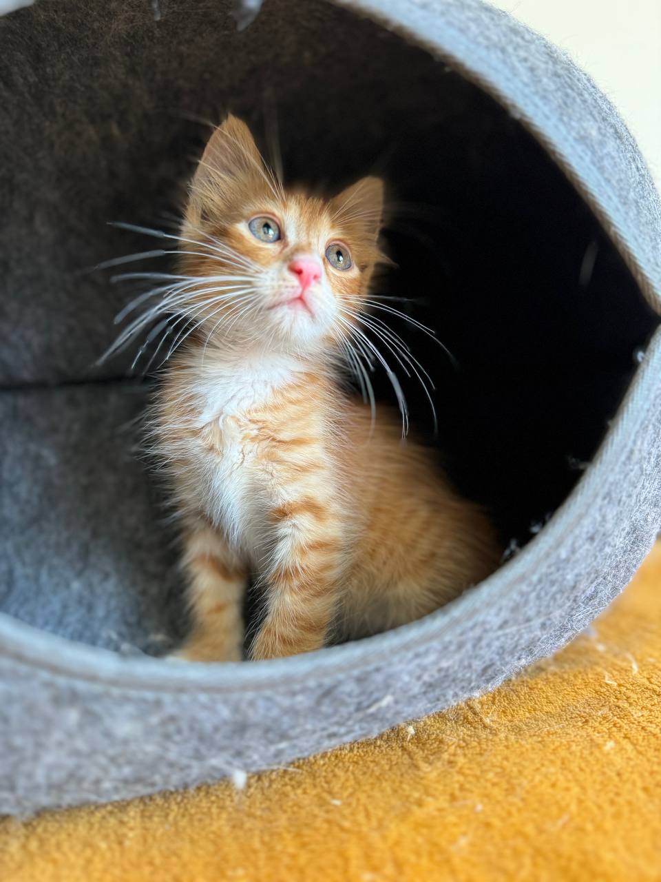 Это рыжее мурчащее солнышко выкинули на набережной в камни на палящее солнце, со второй попытки нам удалось его поймать и забрать домой, отмыли, обработали от блох и паразитов. Rusty около 6-8 недель, кушает без проблем паштет, знает лоток и любит сидеть на ручках и мурчать🥹