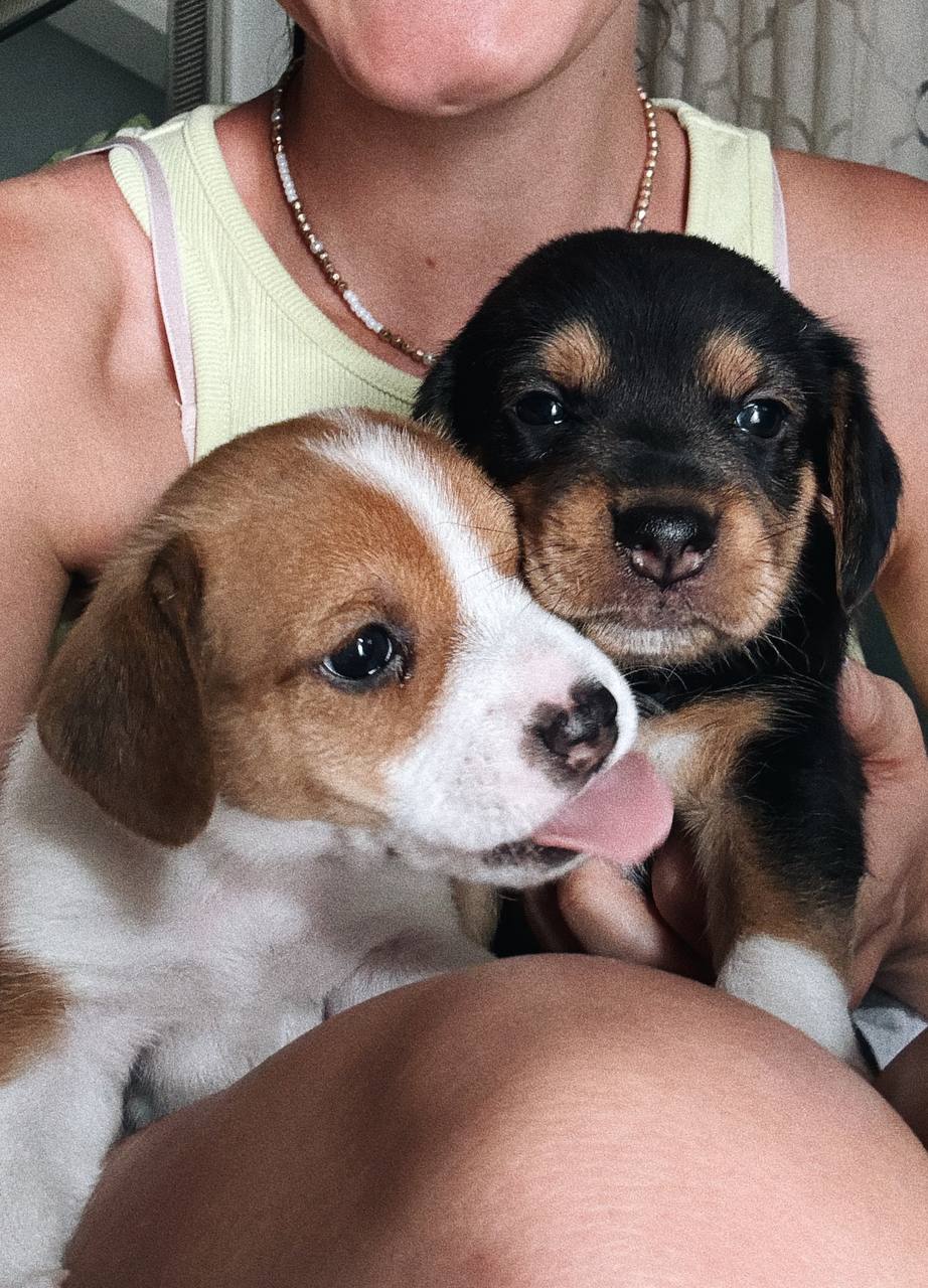 Мама и папа - дворовые кипрские собаки) мама - охотничья, очень красивая собака с длинными ушками (на фото). Папа бело-коричневый пес, убежал как сделал детей, поэтому фоток нет 😅