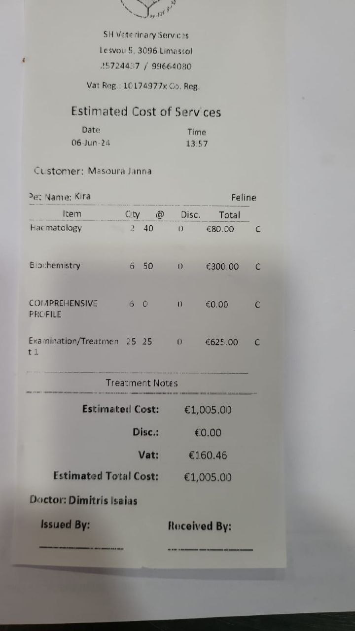 Это Кира. Нашла ее в тяжёлом состоянии. Она 25 дней пробыла в клинике Стелиоса Хораидеса. Счёт 1005 евро. Я пока оплатила только 200 евро. Думала, постепенно насобираю остальное, но не справляюсь. До этого раза никогда не обращалась за помощью.