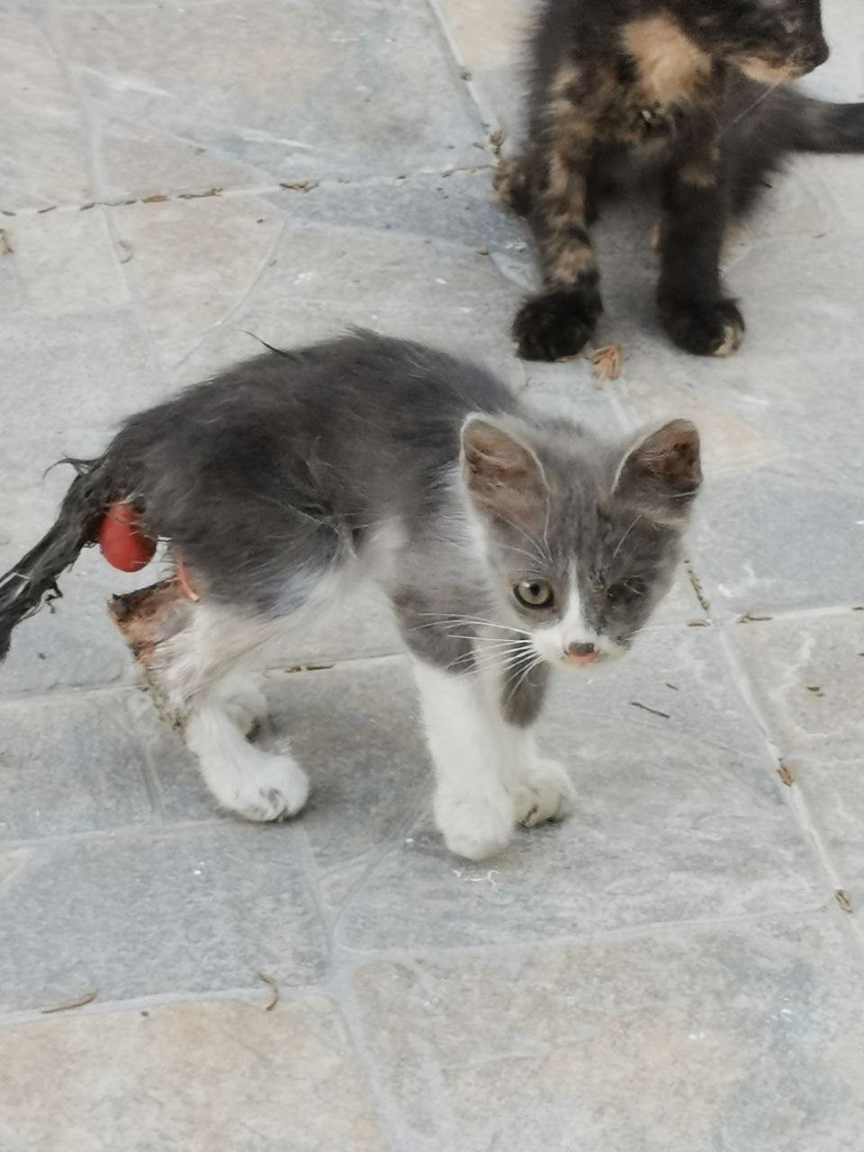 Прибилась кошка с котёнком во двор. Котенок очень плох: у него пролапс и нет глаза. Пугливый, в руки не даётся.