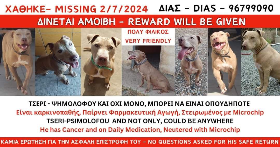 Сорри если уже это сюда приносили, пролистала последние дни, но не нашла.. 2 июля пропал пожилой собакен с онкологией в районе деревень Тсери или Псимолофу под Никосией, но если его украли, то он может быть где угодно. Собаку зовут Диас. Ему необходимо каждый день принимать лекарства. Хозяева предлагают вознаграждение и не будут задавать никаких вопросов, пусть только вернут Диаса. Вдруг кто-то видел 🙏
