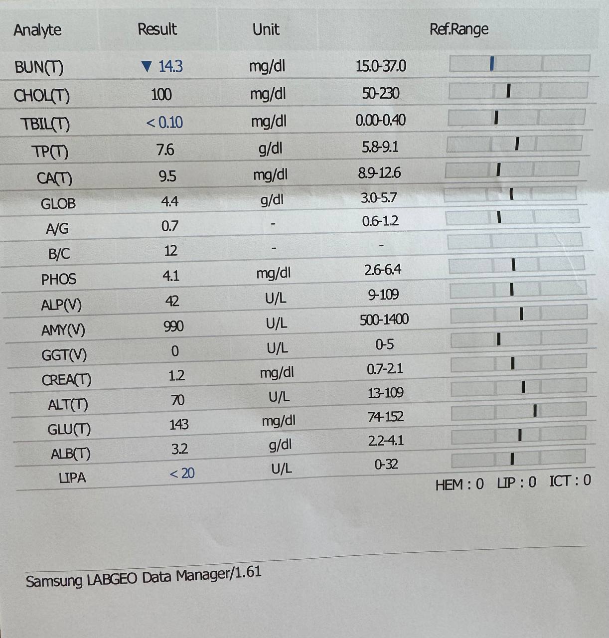 В общем, температура 40,3. Анализ крови взять не дал, лекарство для снижения температуры тоже поставить не дал. Доктор предпочла не седировать кота и не подвергать большему стрессу (сажать в клетку-зажим). Дала диарсанил, мелоксидил в каплях и мальт пасту (была дома), что бы сбить температуру и поддержать ЖКТ.