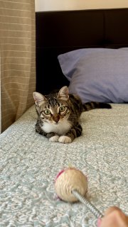 Очень привязалась к ребенку поэтому готова помогать с кормом и наполнителем на постоянной основе, у нее есть туалет, чашки, переноска, игрушки