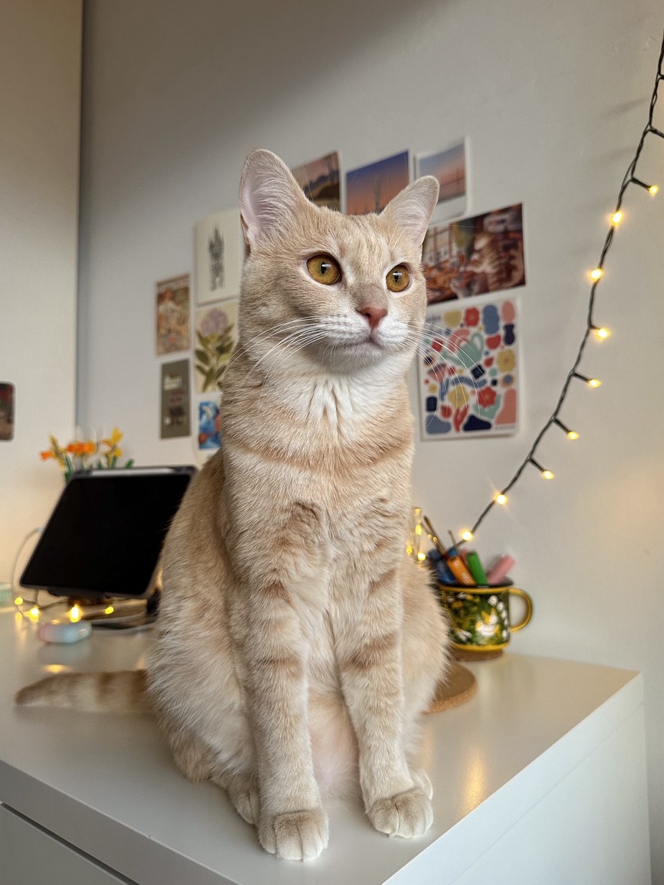 Из характерных особенностей: она стерилизованная, у нее большие карие глаза и однородная по окрасу шерсть светло-бежевого/персикового цвета.