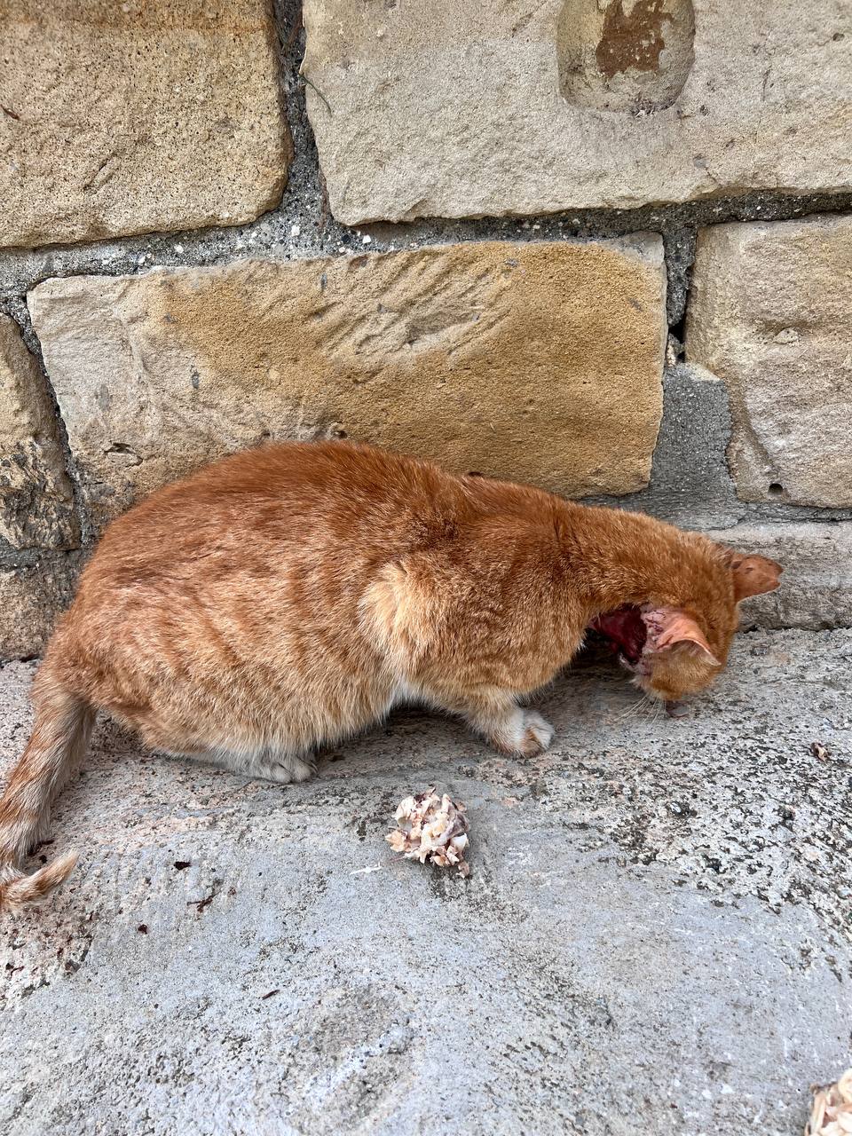 Увидела бездомного кота возле Склавенитиса с огромной раной на шее(((