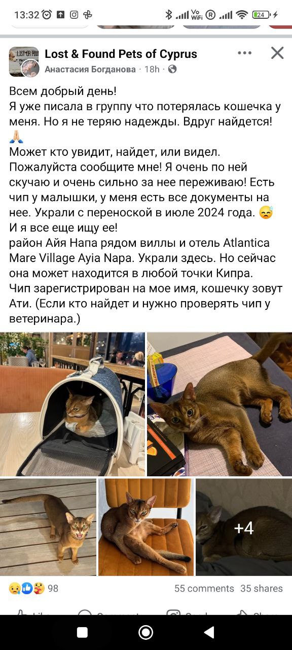 Может быть у кого то есть контакты ловцов Ларнака/Перволия. В комплексе живет котенок, мы его кормим обрабатываем, тут увидели, что повредил лапу, не наступает. Он контактный, гладится приходит. С первого раза поймать не смогли, убежал. Теперь боится меня. В котоловку ловить не пробовали, у нас тут несколько кошек живет, не очень понимаем, кого поймаем😀