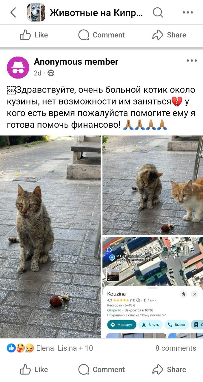 В прошедшую субботу увидела пост в ФБ с просьбой о помощи кошечке в плачевном состоянии, находящейся между Кузиной и Пицца Миа (лимассол, колонакиу). Не смогла проигнорировать, поехали спасать. Кошечку назвали Ласка (она очень добрая и ласковая). Находится на стационаре в small animal hospital. Её планируется выписывать в Пт (2.05) и, в связи с этим,