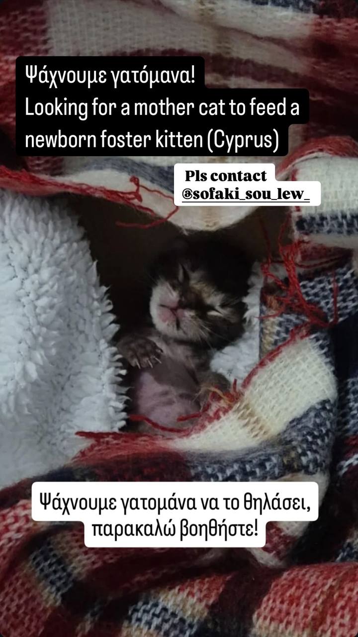 Всем привет! Помогаю киприотским друзьям распространить информацию, может тут кто-то сможет помочь. Они спасли котенка пары дней от роду, слабенький, ищут кормящую маму кошку, чтобы помочь выкормить его. Будем благодарны за любую информацию и помощь