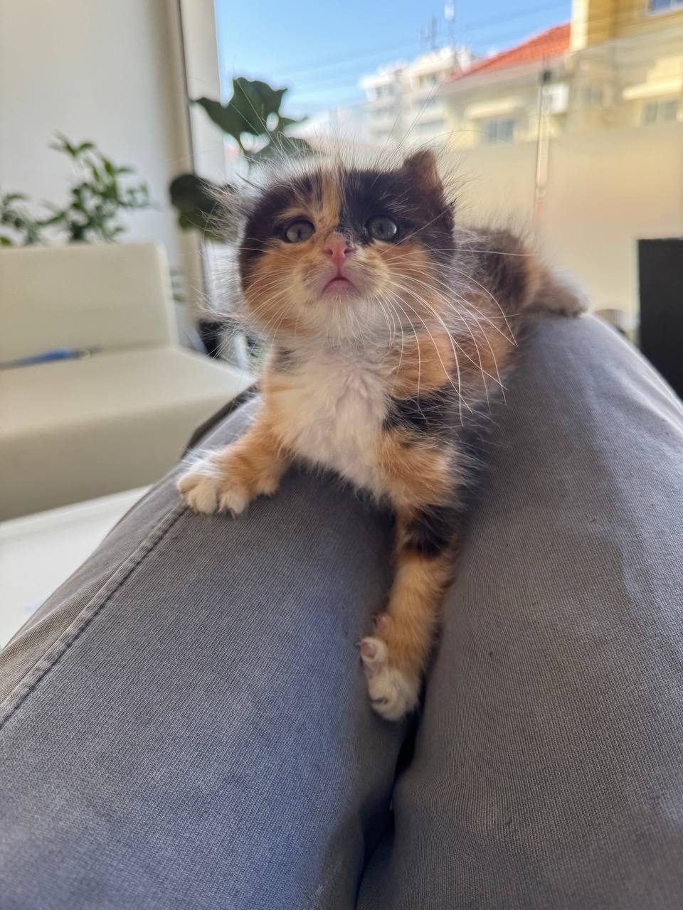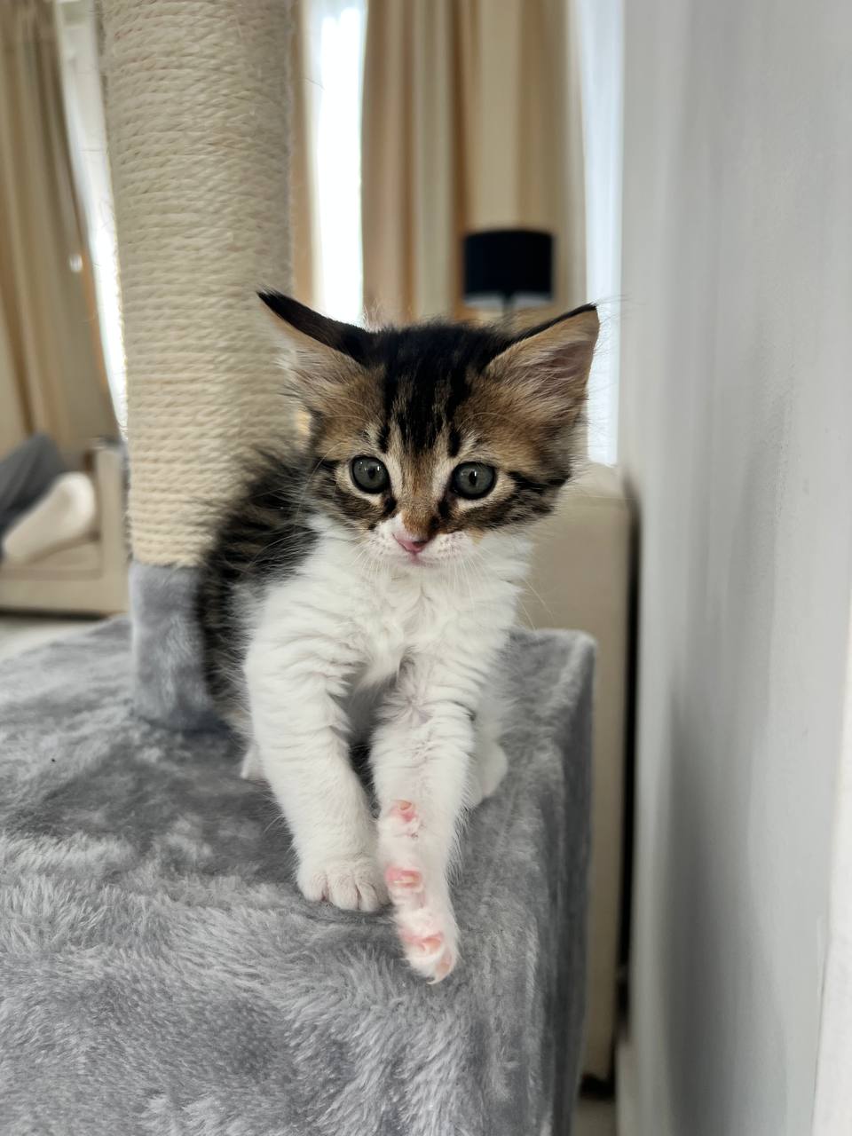 Очень контактная, с радостью сидит на коленках и мурлычет. Прирожденный охотник - ловит листики, гоняется за мухами и таскает тапки.