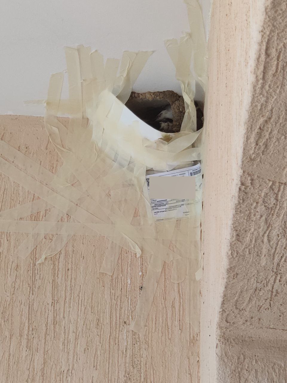 Вот пока так, и один из них теперь не в гнезде, а на бумаге. думаю не буду трогать пока. Налепила, что могла, обычный скотч не держится на рифленой стене. Может у кого есть идеи клейкого материала, вместо скотча. Если пойдет дождь это все отвалится((