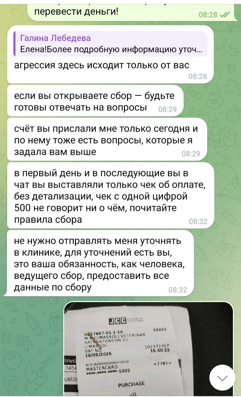 Вот переписка с девушкой за вчера и сегодня!Участники чата, если у Вас закралось сомнение по сбору средств во избежании подобных переписок -не переводите деньги ни какому, берегите свои и чужие нервы!Все диалоги я буду вести в чате, мне абсолютно нечего скрывать, такая ситуация какая она есть , ещё раз задумайтесь-стоит ли помогать животному!