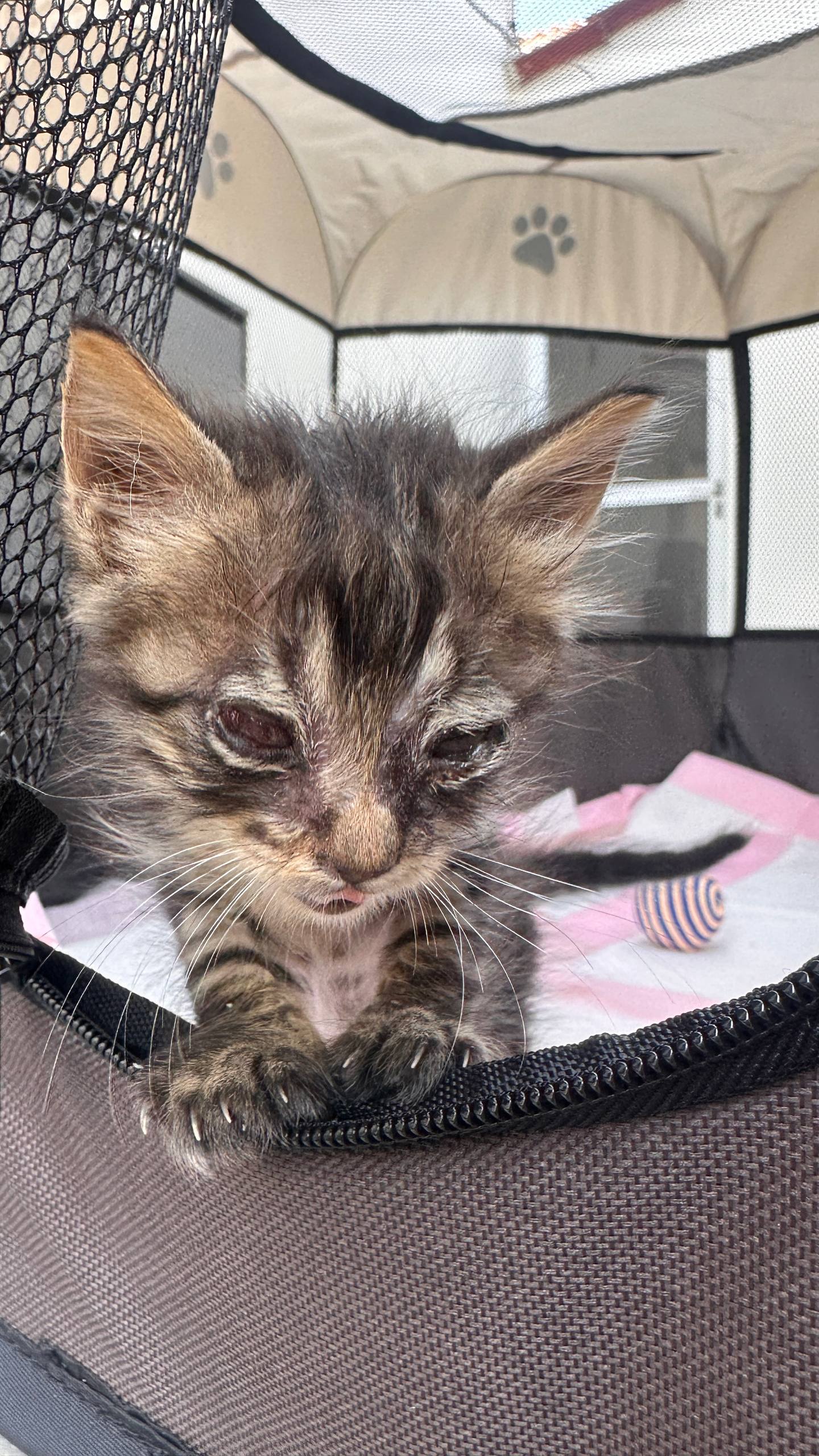 Котенок сейчас живет на улице в манеже, пытаюсь ухаживать, как могу.