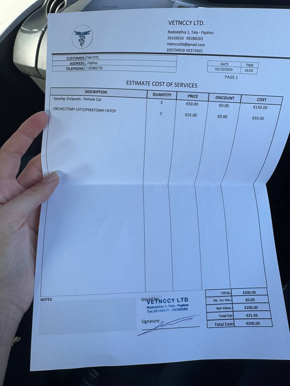 Мне нужна ваша помощь, чтобы продолжить работу по ловле, стерилизации и возвращению кошек (TNR). Недавние стерилизации обошлись в 200 € (смотрите приложенный счет), и мне нужна поддержка, чтобы оплатить их и продолжать помогать большему количеству кошек.
