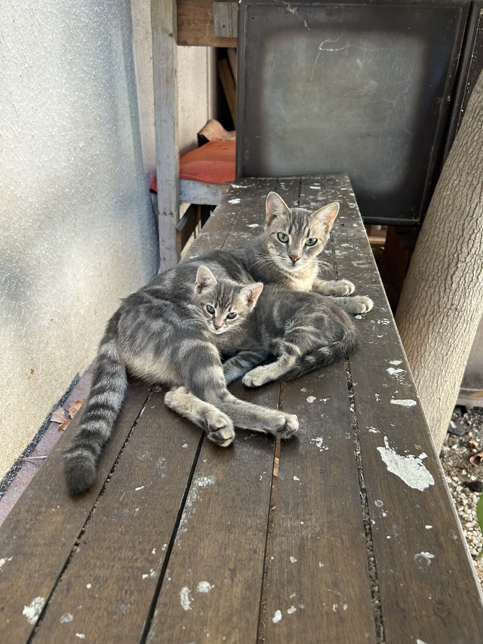 На улице вместе с мамой живёт удивительно красивый котенок с мраморной шерсткой. Мы думаем, что ему около 2 месяцев, но не знаем точно его пол — он еще немного дикий: шипит, если подойти близко, и старается убежать. Но это не агрессия, а страх. Он просто не знает, что такое забота и ласка.