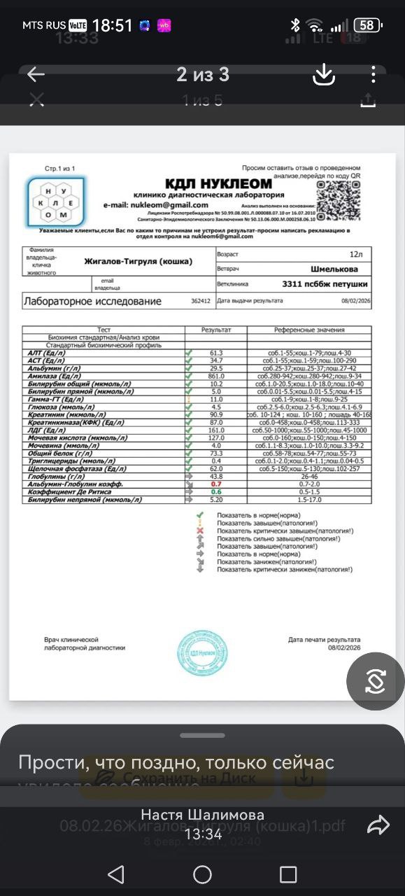@duduka05Друзья, помогите разобраться с анализами у кошки, пожалуйста! У снохи проблемы с котиком. Вот что она мне пишет: "Шнурок стал ооочень часто отрыгивать😒 Сделали УЗИ, взяли анализ крови. На УЗИ киста на почке, нл(вет сказала) она ему не мешает. Анализ крови есть отклонение, но не критично. Сделала ему 4 укола(ветврач), мы давали"альмагель", перевели на новый корм. Вроде все успокоилось. А вот опять началось. И отрыгивает корм и желчь". Снимков УЗИ конечно нет, только анализ крови. Что за четыре укола ему доктор вколола - сноха не знает. Они вообще в деревне живут, хорошо хоть аппарат УЗИ есть. Может есть какие-то идеи в чем может быть дело? Советы от ИИ просьба не давать - я и сама могу погуглить😁
