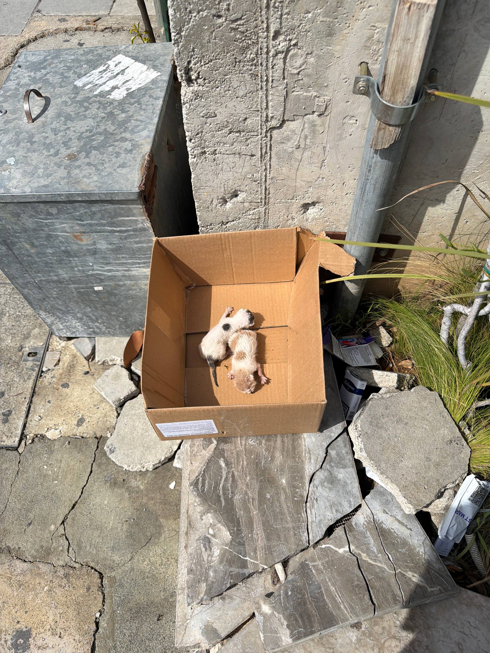 Около Icon, в коробке нашла котят, перенесла их в тенек.