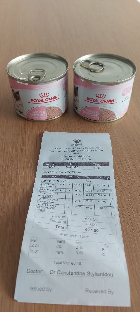 20 февраля - Кошка менее активная, поехали к Эпископи (клиника Пелеканис). Сдали анализы на парвовирус, короновирус и Giardia - отрицательно. Назначили WeBiotic давать 3 дня, сказали, что поможет. Если нет - приехать через неделю, назначат антибиотик. Посоветовали дать еще глистогонное.