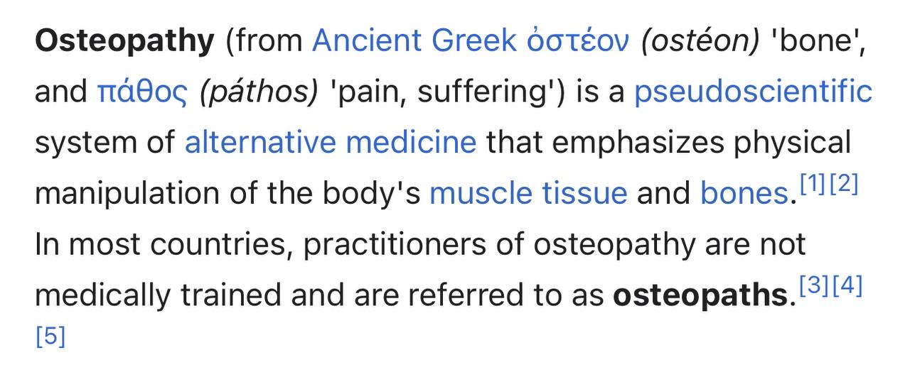 Остеопаты не врачи, спору нет и надо осторожно. Но! В подростковом возрасте у меня был частичный дислокэйшн бедра, выразилось это в том, что одна нога стала буквально кривой и короче. Лучший хЕрург в городе сказал, что ничего не поделать, возраст уже не тот мол. Меня отправили к остепату нашему местному, он практически слепой, учился в Кисловодской школе остеопатии после производственной травмы, от которой ослеп. Он на первом сеансе на ощупь определил в чем проблема и даже сказал изначальную причину, а на втором поставил ногу на место, за что ему век благодарен. МРТ через годы, что интересно, подтвердил его диагноз. Без призывов, просто FYI.