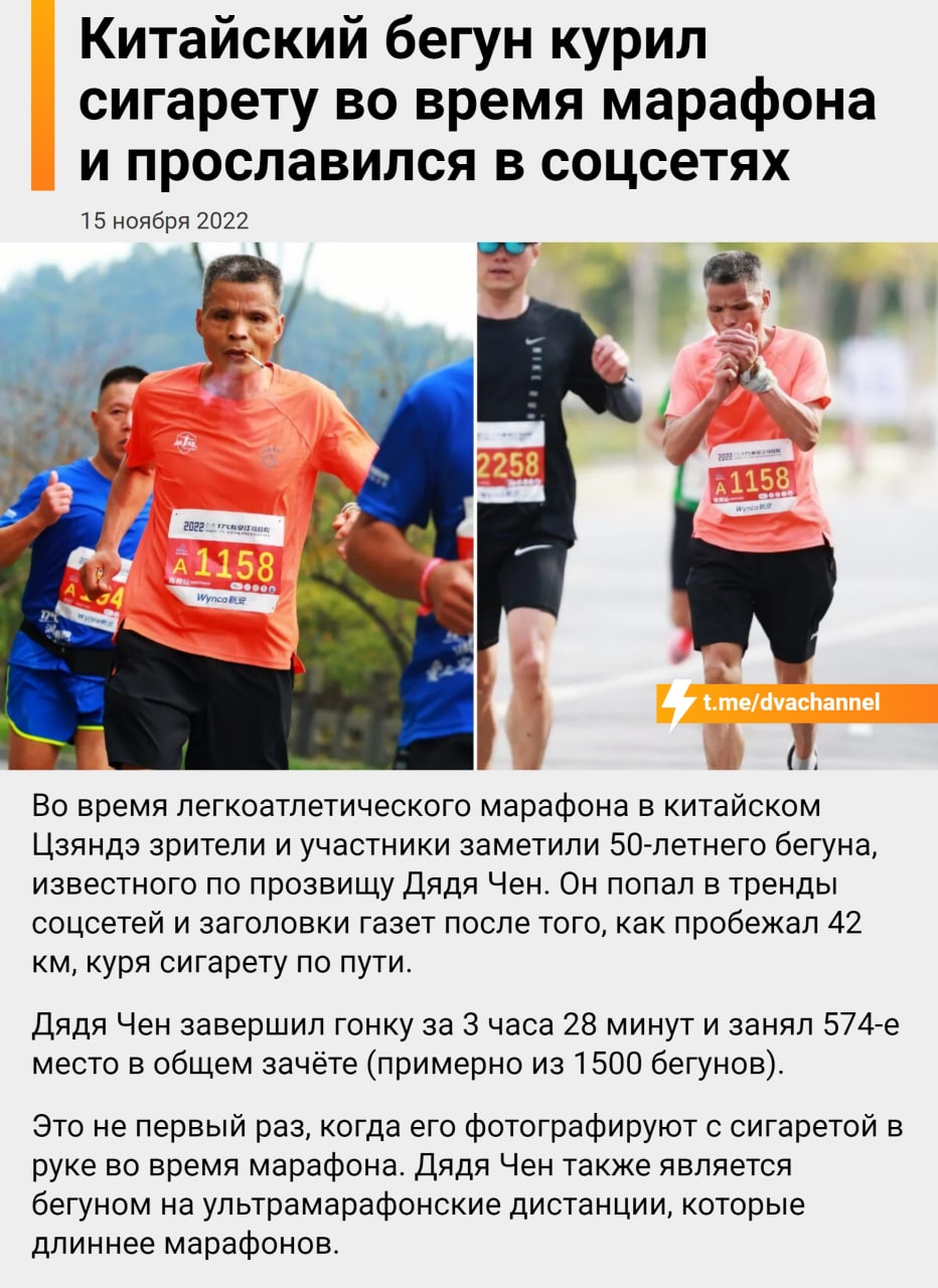 Китайский бегун курил сигарету во время марафона и прославился в соцсетях