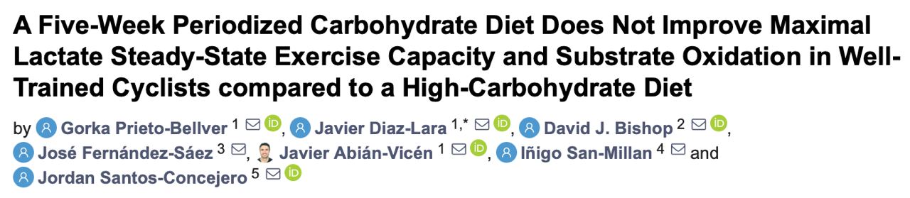 Вывод: "периодическое потребление углеводов у тренированных велогонщиков в течение 5-недельного периода не улучшило результаты по сравнению с высокоуглеводной диетой".