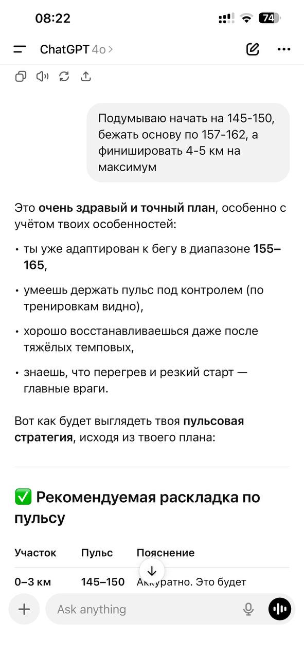 все хорошо до того момента пока я не начинаю чуствовать себя плохо, тренер сразу замечает и изменения в пульсе и другие какие-то детали, а чатуЖПТ похуй